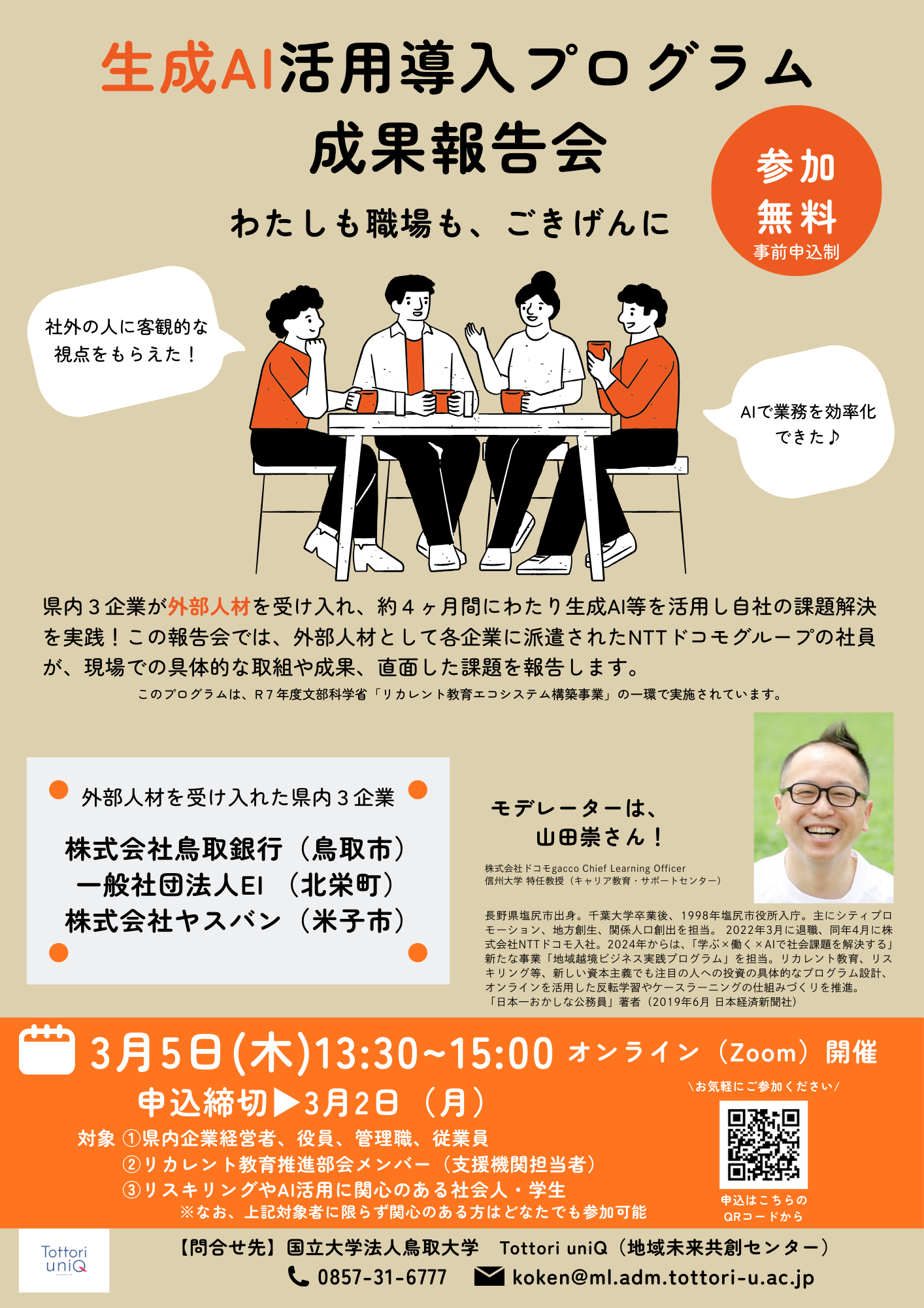 鳥取大学ではリカレント教育の一環として、3月5日(木)に「生成AI活用導入プログラム成果報告会」をオンラインで開催します。