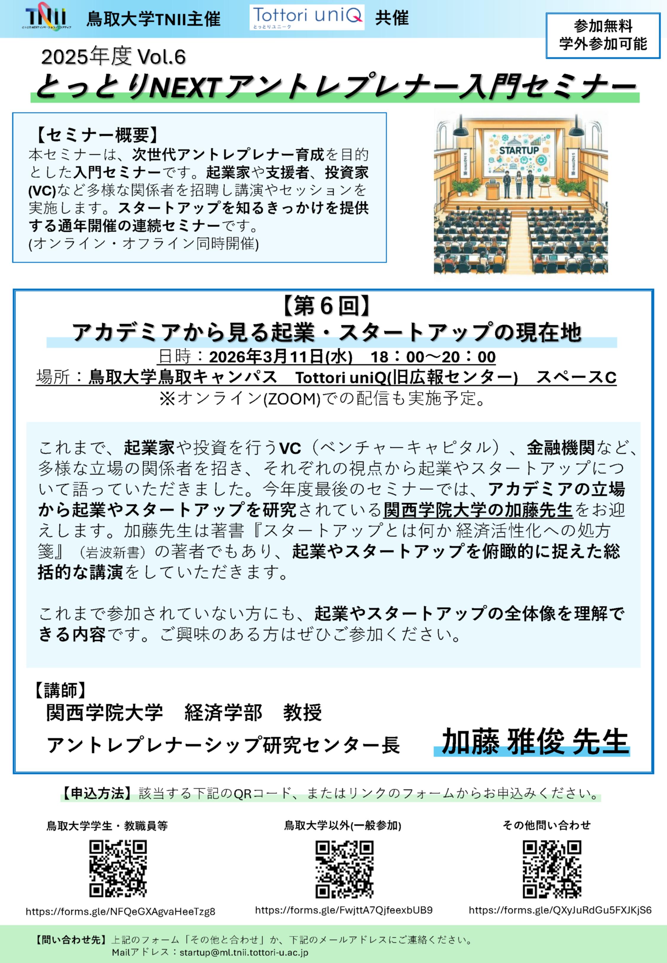 (キャリア開発・育成コンテンツ)第6回「とっとりNEXTアントレプレナー入門セミナー」の開催について